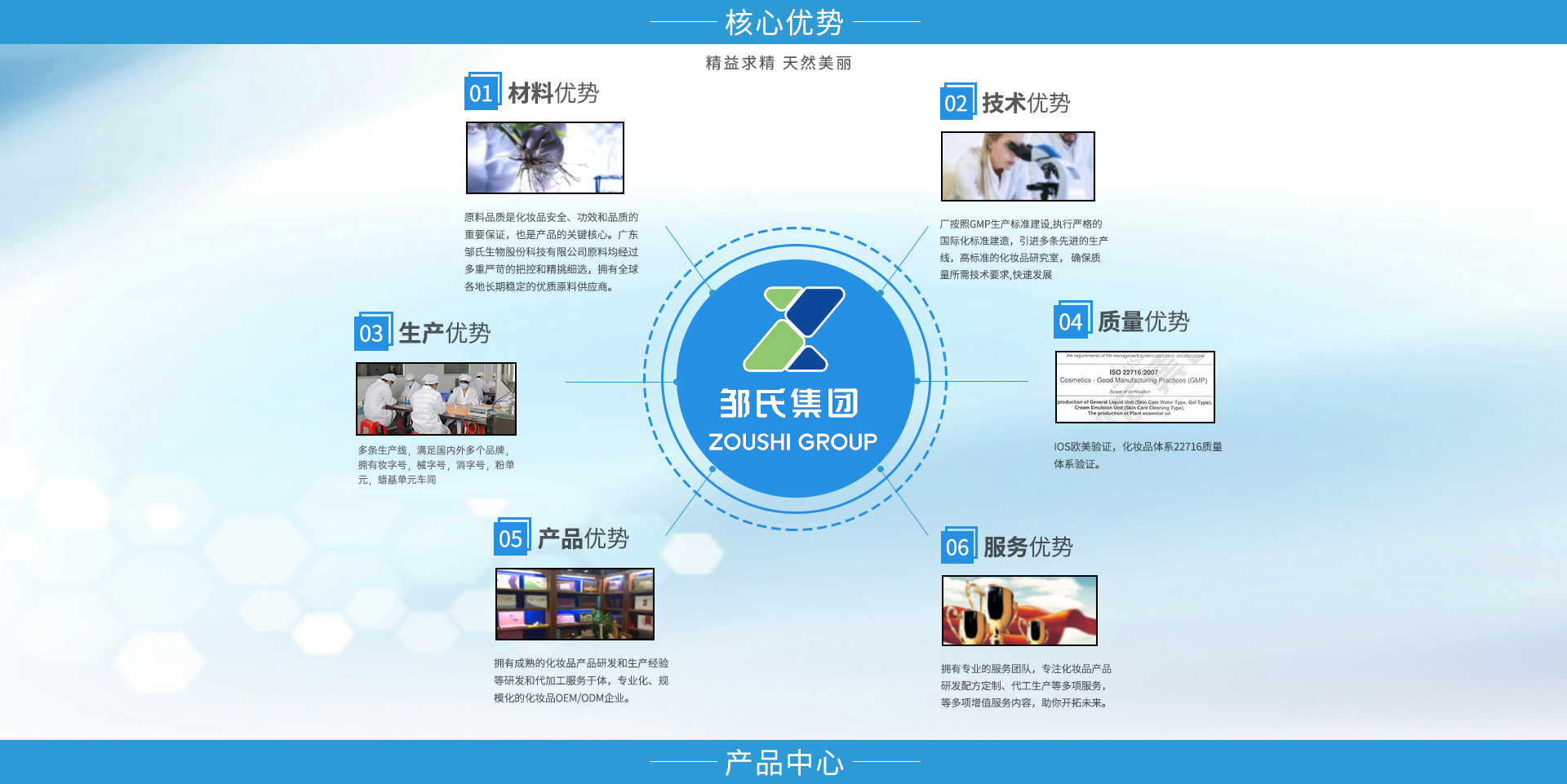 廣東鄒氏生物科技股份有限公司是一家集原料研制、配方開(kāi)發(fā)、加工生產(chǎn)及配套性服務(wù)為一體的全球化化妝品OEM/ODM服務(wù)企業(yè)。鄒氏生物秉承“精益求精,天然美麗”的經(jīng)營(yíng)理念,始終孜孜不倦的在美業(yè)領(lǐng)域深耕,經(jīng)過(guò)不斷發(fā)展完善與技術(shù)提升,在行業(yè)內(nèi)頗具口碑和影響力。公司擁有雄厚的資金實(shí)力、先進(jìn)的生產(chǎn)設(shè)備以及大批高精專的人才儲(chǔ)備,旨在打造一個(gè)純自主研發(fā),純自主生產(chǎn)以及管理的高科技日用美妝OEM/ODM品牌。 在延續(xù)高質(zhì)量產(chǎn)品和服務(wù)的同時(shí),鄒氏生物始終秉承著純粹的生產(chǎn)理念,在研發(fā)、生產(chǎn)、品控、營(yíng)銷等多方面升級(jí),配備雄厚的科研力量,引進(jìn)先進(jìn)生產(chǎn)設(shè)備,遵循嚴(yán)苛的品質(zhì)管理標(biāo)準(zhǔn),提供專業(yè)的全方位營(yíng)銷服務(wù),最大程度地實(shí)現(xiàn)資源整合,致力于成為世界優(yōu)秀化妝品工廠。為廣大品牌商以及消費(fèi)市場(chǎng)輸送品質(zhì)優(yōu)越、高效安全的日用化工、美容美妝、肌膚護(hù)理產(chǎn)品。